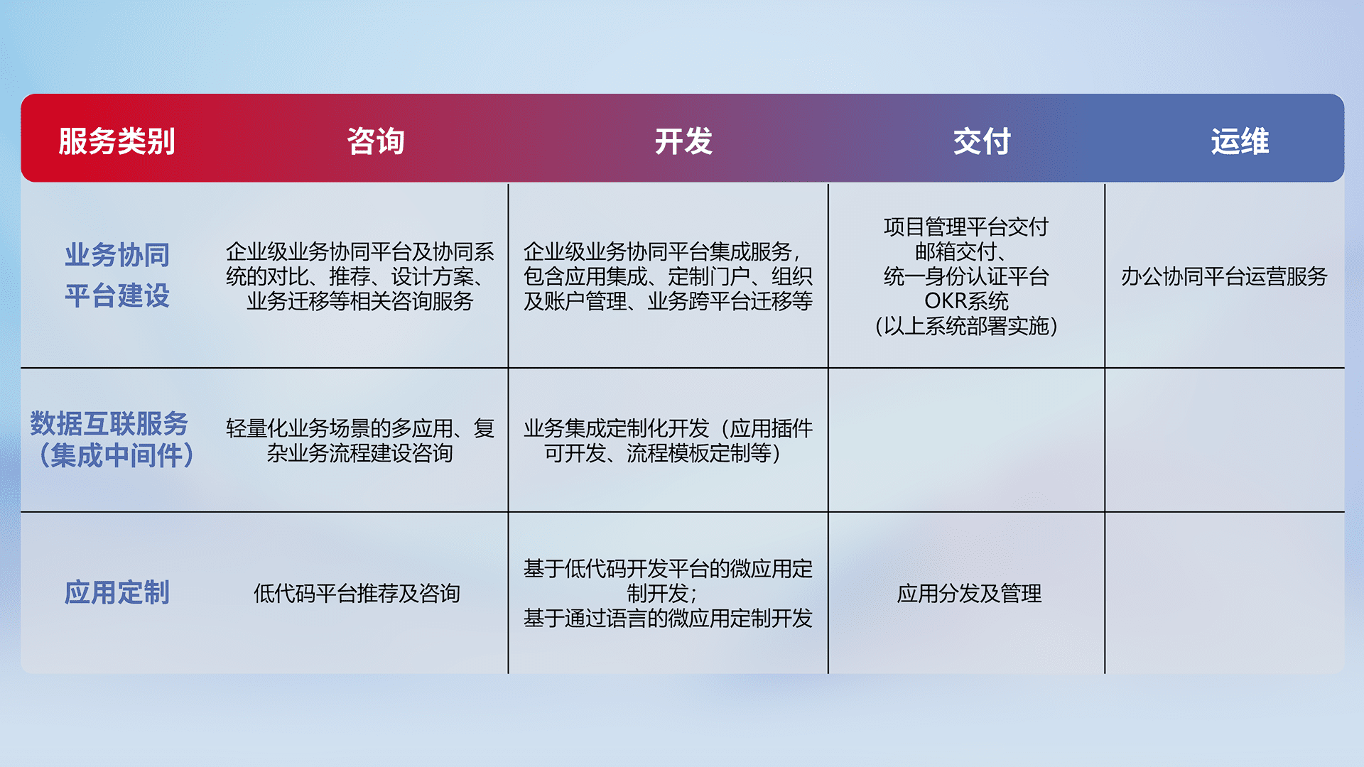 针对钉钉、、、企微、、、IDaas等平台级产品提供产品的规划、、方案、、、、交付、、、定制化开发等服务,,实现如统一协同办公、、、、智能客户服务、、、、混合会议管理、、智能数据查询、、、等业务场景,,,实现数字化转型。。。。