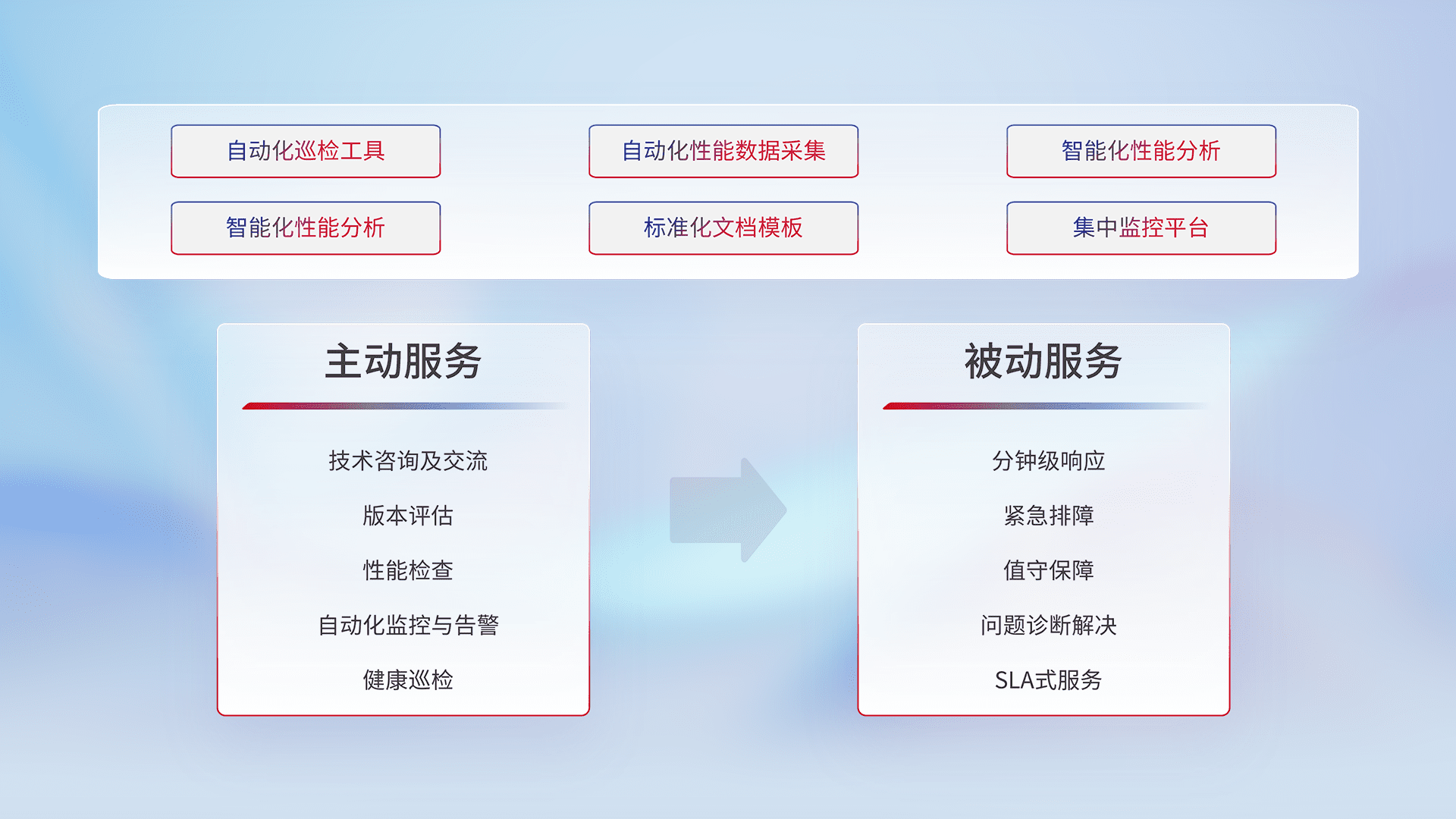 智能化工具和标准化文档,,,,保障服务质量,,,,提供主动服务(包含技术咨询、、版本评估、、、性能检查、、自动化监控与告警、、、、健康巡检)和被动服务包含(分钟级响应、、、、紧急排障、、值守保障、、、问题诊断解决、、、SLA服务)。。